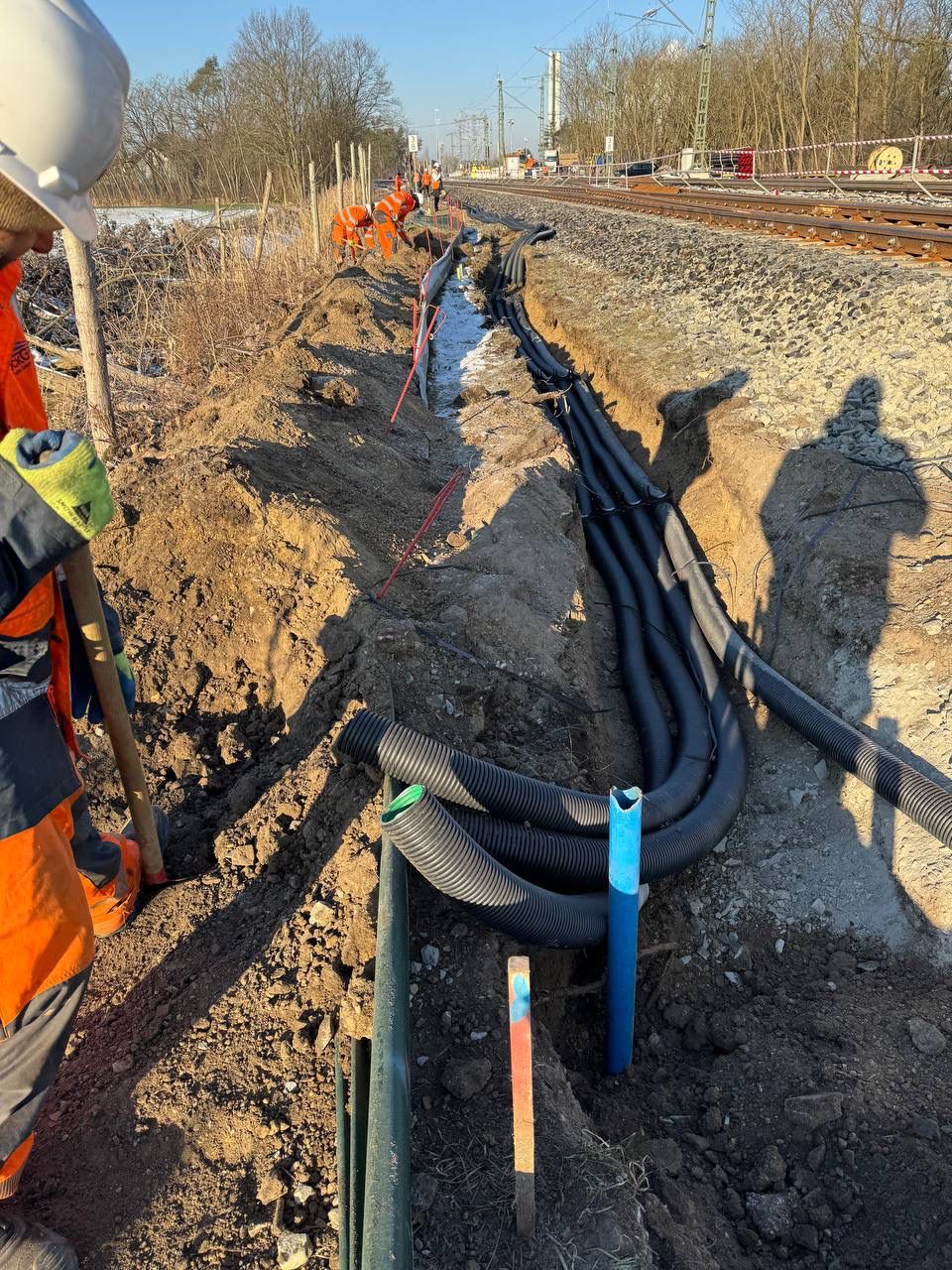 In Cottbus wurden im Auftrag der Deutschen Bahn umfangreiche Gleis- und Kabeltiefbauarbeiten durchgeführt. Die Maßnahmen umfassten den Aus- und Einbau von Schwellen und Schienen, die Erneuerung von Kabeltrassen, sowie Erd- und Fundamentarbeiten zur Vorbereitung der bahntechnischen Anlagen.